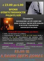 В Республике Беларусь действует запрет на нахождение несовершеннолетних в возрасте до 16 лет в общественных местах с 23.00 до 06.00 без сопровождения взрослых.
